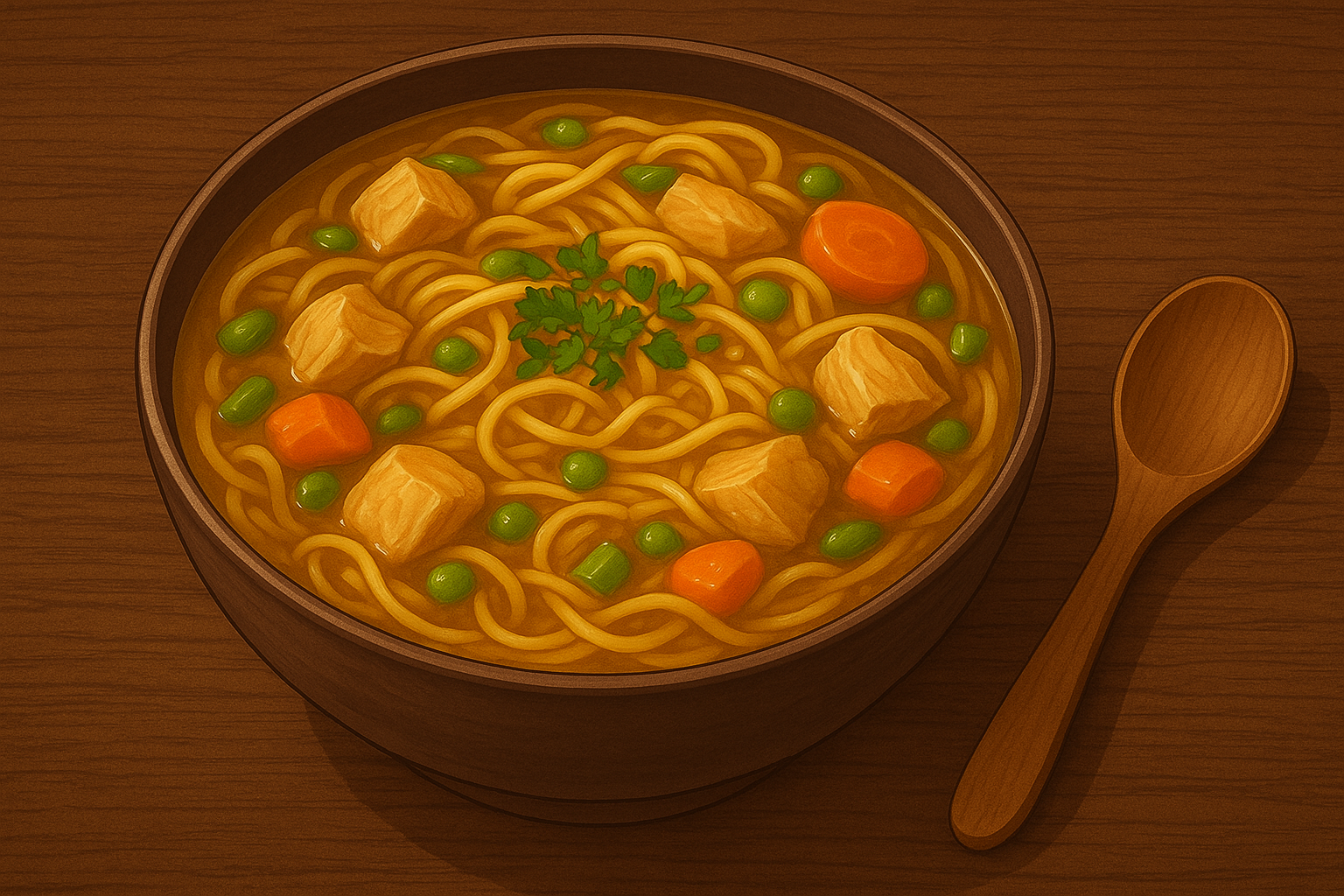 Springy noodles stir-fried in a hot wok with strips of marinated chicken, crunchy vegetables, soy sauce, and Nepalese spices.
