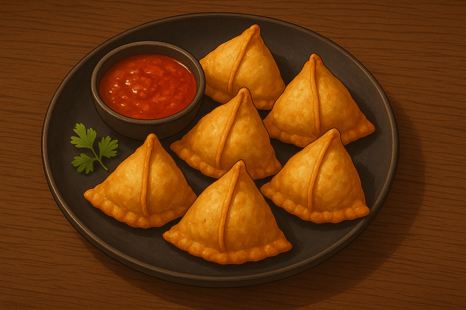 Samosa , red onion, green chilies, yogurt fresh coriander with gravy